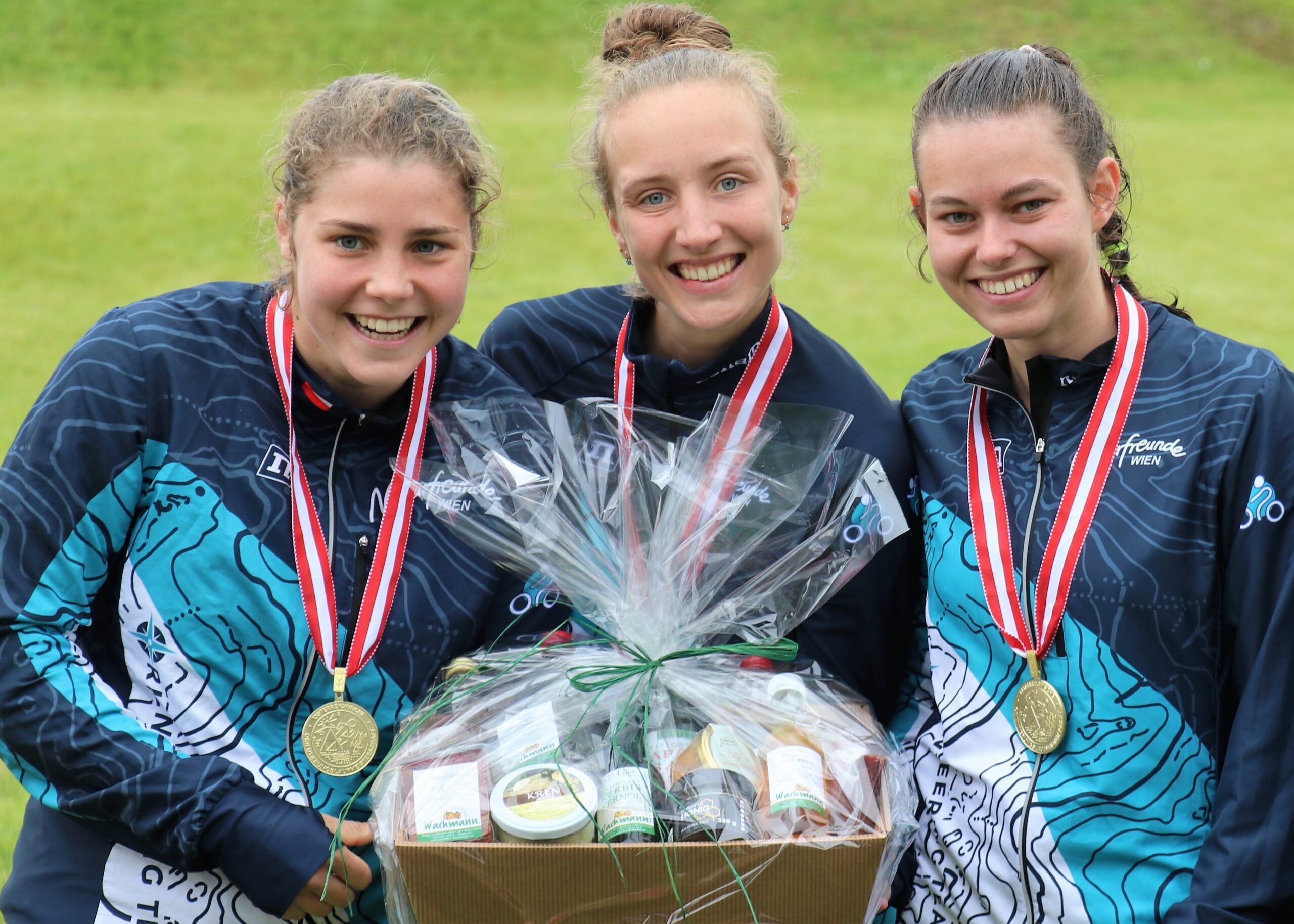 Dann kam der Regen und unsere Elite-Frauen,  jeweils stark. Team 1 mit Jasmina, Tina & Ylvi nahm gleich das Heft des Handelns in die Hand. Das Postennetz zu Beginn lösten sie schneller und besser als die Konkurrenz. Schon beim ersten Sammelposten betrug der Vorsprung über 2 Minuten. Und er wuchs an. Souverän und sehr zügig absolvierten die drei die weitere Strecke, die Führung war nie in Gefahr. So waren Jasmina, Tina & Ylvi nach 70 Minuten jubelnd im Ziel und konnten es mit den Toten Hosen halten: „Feiern im Regen“ war angesagt und der ÖM-Titel vor dem OLC Graz fix. Die Revanche für die Staffel-Entscheidung war gelungen. Team 2 mit Anika, Maya & Rita klassierte sich auf Platz 5 dieser österreichischen Meisterschaft.