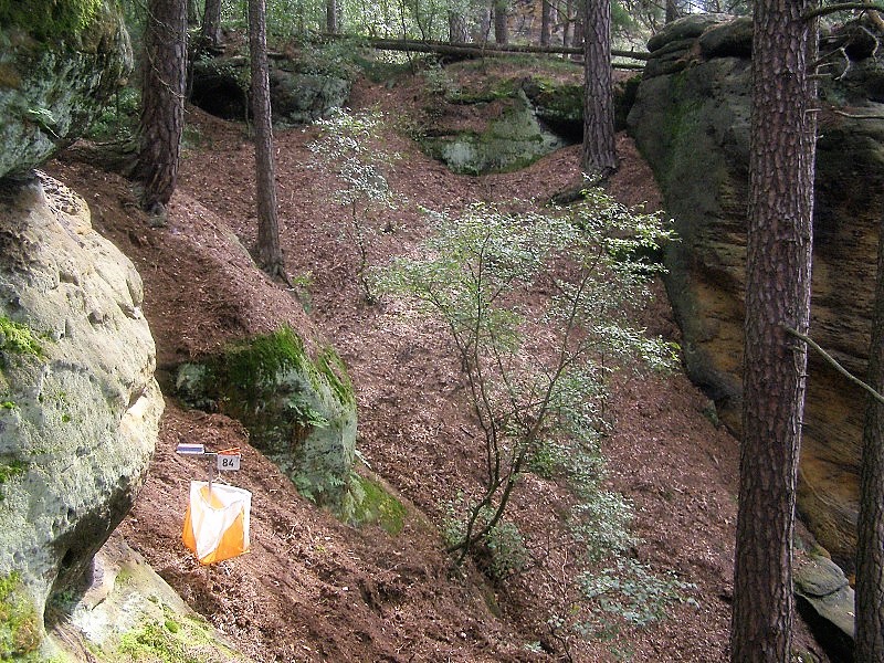 Und es wird immer noch besser. Es wird sogar legendenhaft. Die eine geht so: Der junge Ritter Jaroslav ging im Modlivý důl [Gebetsgraben] mit der geliebten Tochter des Braumeisters freiwillig in den Tod, weil seine Eltern gegen diese Verbindung waren. Die andere ist auch nicht besser: Ein Jüngling tötete hier einst einen Nebenbuhler. Erweiterter Suizid und Mord aus Eifersucht, klingt nach wilder Gegend. Irgendwann entstand in diesem 1 Kilometer langen, tief eingeschnittenen und   romantischen Felsental ein Wallfahrtsort. Im 18. Jahrhundert wurde eine beeindruckende Felsenkapelle in die mächtigen Sandsteintürme gehauen. Während unserer außergewöhnlichen Mitteldistanz kommen am vierten Tag viele an der Kapelle vorbei. Außergewöhnlich kurz – weil außergewöhnlich steil – sind die Bahndaten. In diesem Gelände kann man eingehen wie Böhmisches Leinen. Es ist ein harter Tag im Wald. Geht die Kraft aus, geht man ein.