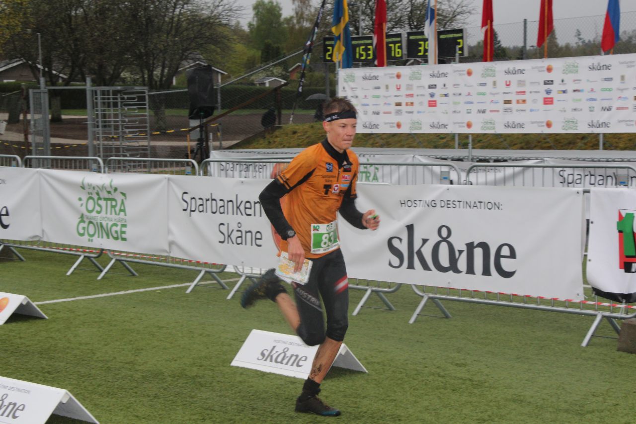 Nico nacherzählt: „Meine erste 10Mila. Gespannt was mich erwarten würde, aber top motiviert reiste ich ins südschwedische Glimakra. Einzige Anweisung des Bundesheertrainers Martin Binder: saug einfach das ganze auf, genieß‘ es – Jawohl, aufsaugen! Befehl ist Befehl. In diesem Fall ein besonders leicht zu befolgender Befehl, denn aufzusaugen gab es einiges. Vor allem Wasser. Wasser von oben, in Form von der ganzen Nacht andauernden Schauern. Wasser von unten, in Form von tiefen Sümpfen, welche vor allem gegen Ende der Bahn unvermeidlich waren. Wasser von der Seite, in Form von einigen Getränkeposten, welche trotz perfekten OL-Wetters auf meiner 12km langen Strecke absolut nötig waren. Und ich braver Rekrut – falsch- Gefreiter habe all das aufgesaugt. Mehr oder weniger freiwillig. Doch neben Wasser in jeder Form gab es einiges mehr aufzusaugen. Zum Beispiel den spektakulären Start der über 300 Teams. Oder die immense Arena mit riesiger Leinwand uns allem was dazugehört. Kurz gesagt eine super Stimmung, ein unglaubliches Feeling. Ein Erlebnis, das von einem sehr zufriedenstellenden Lauf gekrönt wurde. Aber alles von vorne: Nachdem ich um 20:30Uhr das Startspektakel live miterleben durfte, ging es schnellstmöglich zurück ins Vereinsquartier von OK Pan Kristianstad, meinem schwedischen Verein, für den ich die 8 Strecke im 2. Team absolvieren sollte. Das Quartier befand sich einen Ort weiter in Högsma. Dort verfolgte ich noch die sensationellen Läufe unserer beiden Startläufer Matthias Gröll für OK Pan 1 und Franz Glaner für Team 2 über die Live-Übertragung, ehe ich mich niederlegte. Gegen 3 Uhr riss mich mein Wecker aus dem bis dahin nicht wirklich vorhandenen Schlaf. Nach einem kleinen Frühstück ließ ich mich von Fahrer Per in die Arena shuttlen. Geplante Übergabe für das schnellste Team war um 4:24, ich durfte mit knapp 2 Stunden Verspätung in meine Strecke gehen, welche eigentlich als Dämmerungs- / Tagstrecke ausgeschrieben war. Das war sie aber aufgrund des schlechten Wetters um 6:24 immer noch nicht, weshalb ich mit Lampe ausgestattet ins Rennen ging. Fokussiert arbeitete ich die über 30 Posten der Strecke ab. Entgegen meiner Vorstellung dieser Staffel war ich großteils komplett alleine unterwegs. Trotzdem gelang es mir 10 Plätze gutzumachen ehe ich den vorletzten Läufer meines Teams auf seine Strecke schickte. Schlussendlich landete OK Pan Kristianstad 2 auf dem zufriedenstellenden 69. Rang.“