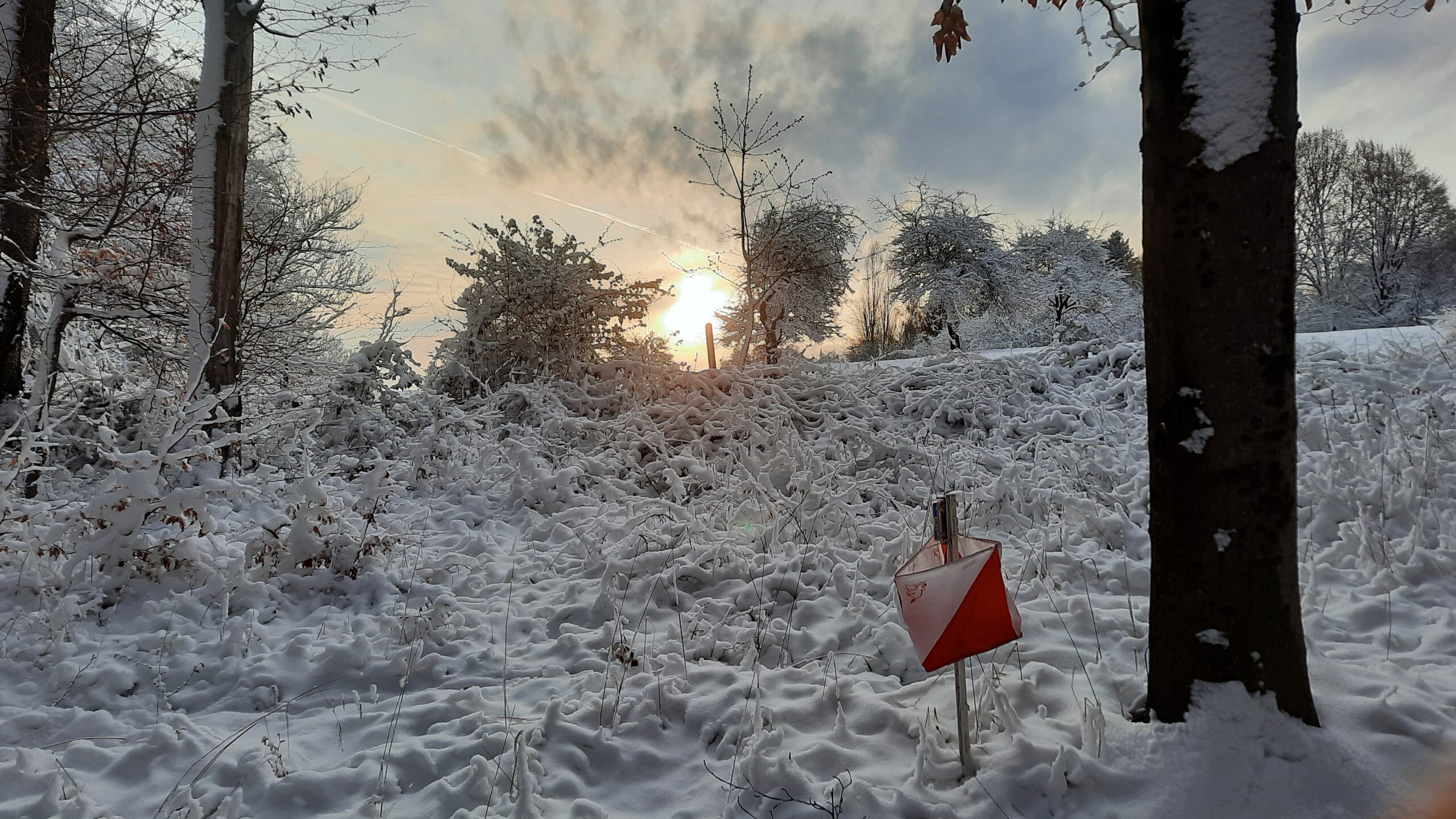 Zwischendurch blinzelt sogar kurz die Sonne zwischen den Ästen hervor und hinterlässt ein Glitzern im Schnee und in unseren Augen. Winter-Idylle beim Fuß-OL.