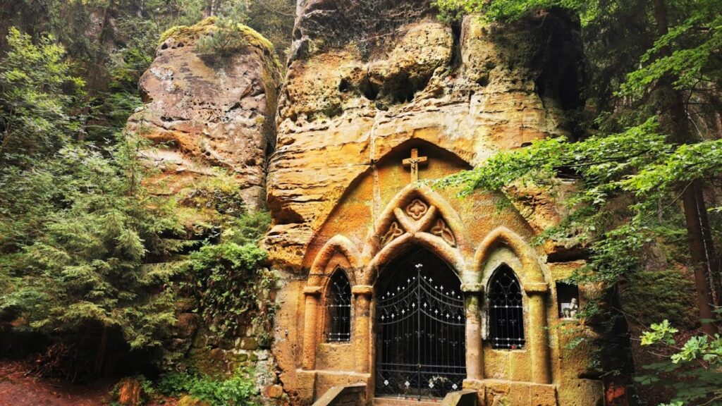 Und es wird immer noch besser. Es wird sogar legendenhaft. Die eine geht so: Der junge Ritter Jaroslav ging im Modlivý důl [Gebetsgraben] mit der geliebten Tochter des Braumeisters freiwillig in den Tod, weil seine Eltern gegen diese Verbindung waren. Die andere ist auch nicht besser: Ein Jüngling tötete hier einst einen Nebenbuhler. Erweiterter Suizid und Mord aus Eifersucht, klingt nach wilder Gegend. Irgendwann entstand in diesem 1 Kilometer langen, tief eingeschnittenen und   romantischen Felsental ein Wallfahrtsort. Im 18. Jahrhundert wurde eine beeindruckende Felsenkapelle in die mächtigen Sandsteintürme gehauen. Während unserer außergewöhnlichen Mitteldistanz kommen am vierten Tag viele an der Kapelle vorbei. Außergewöhnlich kurz – weil außergewöhnlich steil – sind die Bahndaten. In diesem Gelände kann man eingehen wie Böhmisches Leinen. Es ist ein harter Tag im Wald. Geht die Kraft aus, geht man ein.