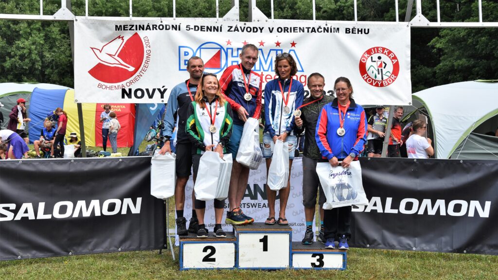 Der fünfte und letzte Tag im Wald ist wieder ein besonderer. Auf der Karte Medvědí kemp [Bärenlager] gehen die rund 1.600 Läuferinnen & Läufer aus über 25 Nationen auf eine abschließende Pirsch. Gejagt werden die Führenden in der Gesamtwertung nach 4 Tagen. Darunter sind auch Babsi [D50-] und Ernst [H80-]. Beide werden von der Jagdgesellschafft nicht erwischt. Beide gewinnen ihre Kategorie und müssen Gott sei Dank nicht ewig auf die Siegerehrung warten Da vergeht in Böhmen kein Viertel.