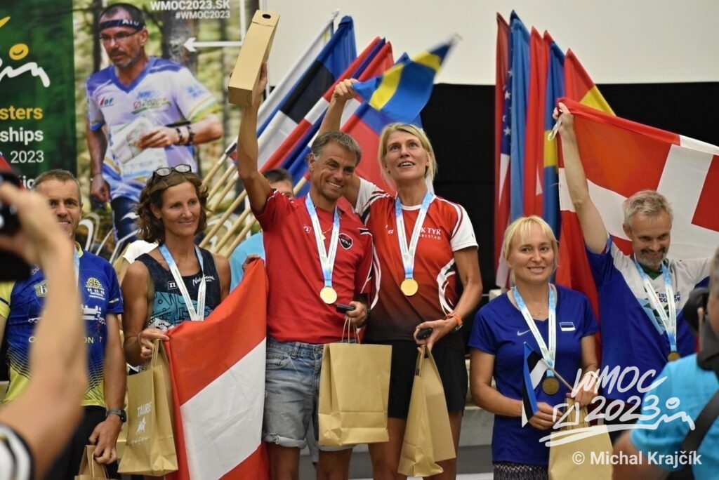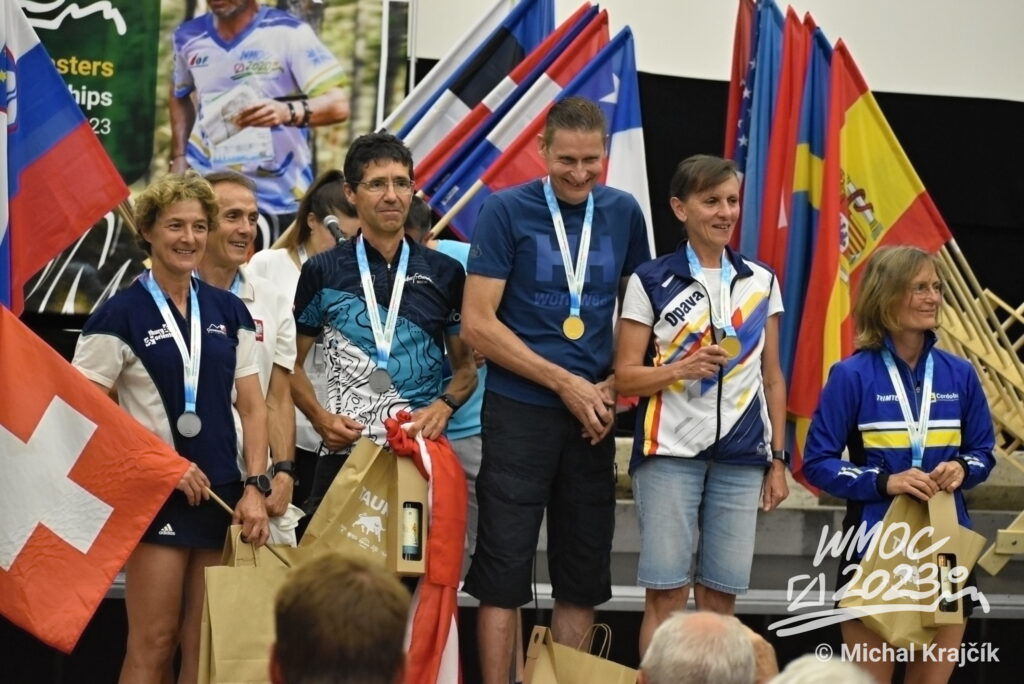 Die Siegerehrung beginnt mit den „Nachwuchskategorien“ Frauen und Männer ab 35 Jahren. Die Stimmung ist gut. Bald kommt Babsi [W50-] an die Reihe. Die Sprint-Weltmeisterin von 2021 erobert diesmal die Silbermedaille, nur 2 Sekunden fehlen ihr im Ziel auf Gold. An diesem Tag gilt die NFW-Erfolgsformel +2×2 = Doppelsilber, denn der Sprint-Weltmeister von 2021, Ferri [M55-] schnappt sich mit dem gleichen Rückstand ebenfalls die Silbermedaille. Wieder ist Gold nur 2 Sekunden entfernt. Für beide war es trotz der extrem knappen Entscheidung keine verlorene Goldmedaille, sondern eine gewonnene Silberne.